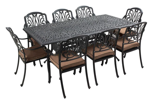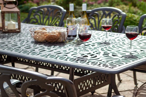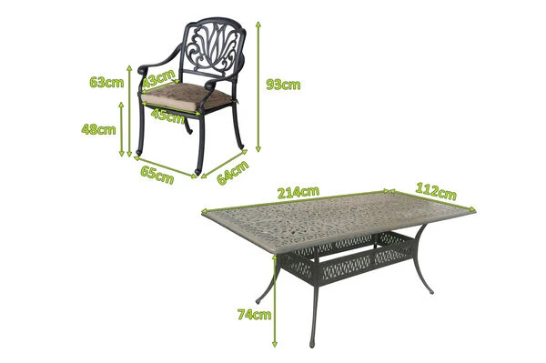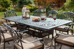 Der Esstisch ist komplett gefertigt aus hochwertigem Aluminium-Guss, was sie sehr robust und wetterresistent macht. Dadurch eignet sie sich ideal für den Außenbereich und kann unbesorgt das ganze Jahr über im Freien stehen bleiben. Die Möbel sind in einem schönen Braun/Bronzeton gehalten und bietet Ihnen den höchsten Standard an Qualität und Verarbeitung.