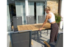 Der Hersteller setzt dabei, neben dem minimalistischen Design, vor allem auf besonders hochwertige Materialien. Diese sind dabei ebenso robust wie edel. Das beginnt schon beim stabilen Rahmen: Durch den Einsatz von Aluminium kann nicht nur die Optik ĂŒberzeugen, sondern auch die hohe Robustheit. Der Gartentisch bietet mit seinen MaĂen von ca. 160/220 x 90 cm bei einer Höhe von ca. 74 cm ausreichend Platz um gemeinsam schöne Stunden bei einem Brunch im Garten zu verbringen. Die Tischplatte besteht aus Teakholz und lĂ€sst sich durch einen geschmeidigen Butterfly-Auszug problemlos von ca. 160 cm auf ca. 220 cm verlĂ€ngern, sodass Sie zahlreiche PlĂ€tze fĂŒr GĂ€ste schaffen. Die hochwertige Materialauswahl und die sorgfĂ€ltige Verarbeitung sorgen nicht nur fĂŒr die exklusive Optik dieses Ausziehtisches, sondern machen den Tisch auch sehr stabil. GenieĂen Sie mit gutem Gewissen entspannte Stunden im GartenDie Tischleisten aus FSC-zertifiziertem Teakholz verleihen diesem Tisch einen ganz besonderen Charme. DarĂŒber hinaus ist Teakholz besonders witterungsbestĂ€ndig und hĂ€lt sowohl Hitze und Frost, als auch Regen und Feuchtigkeit aus. Es hat auĂerdem aufgrund des hohen Anteils an holzeigenen Ălen einen natĂŒrlichen Schutz gegen Pilze und andere SchĂ€dlinge.Die Sessel aus der Alice-Serie von Hartman ĂŒberzeugen durch die qualitative Verarbeitung und die Verwendung ausgesuchter Materialien. Die Armlehnen aus FSC-zertifiziertem Teakholz erzeugen eine unverwechselbare Optik und machen die StĂŒhle zu einem einzigartigen MöbelstĂŒck. Das Gestell aus robustem Aluminium sorgt fĂŒr ein geringes Eigengewicht von ca. 4,3 kg den Multipositionssesseln, sowie 5,3 kg bei einer hohen StabilitĂ€t, sodass die Sessel mit bis zu 130 kg belastbar sind. Um Ihren Terassenboden vor Kratzern und Macken zu schĂŒtzen, verfĂŒgen die FĂŒĂe ĂŒber praktische Bodenschoner. Dank der vorteilhaften Stoffzusammensetzung der 4×4 Textilenbespannung aus 70% Polyvinylchlorid und 30% Polyester profitieren Sie von einer langen Haltbarkeit. Das flexible Material trotzt spielend den ĂŒblichen WitterungseinflĂŒssen, passt sich optimal Ihrem Körper an und macht die Modelreihe auch ohne Auflage sehr bequem.