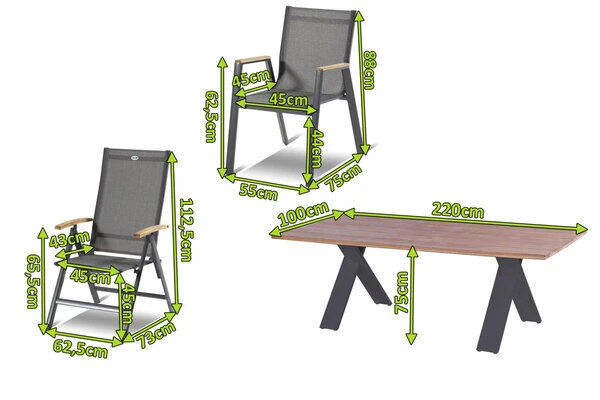 Der Tisch mit dem gekreuzten Gestell ist gefertigt aus pulverbeschichtetem Aluminium in der Farbe Xerix (Anthrazit) und wird optisch perfekt durch die Tischplatte aus SVLK-zertifiziertem Teakholz ergänzt. Die Maße von ca. 220 x 100 x 75 cm sorgen dafür, dass stets ausreichend Ablagefläche zur Verfügung steht und bequem 8 Personen genügend Platz finden.