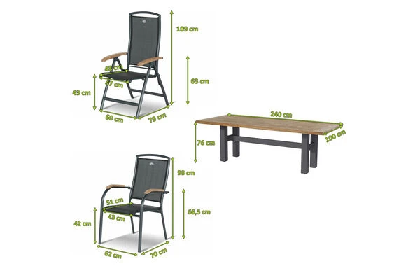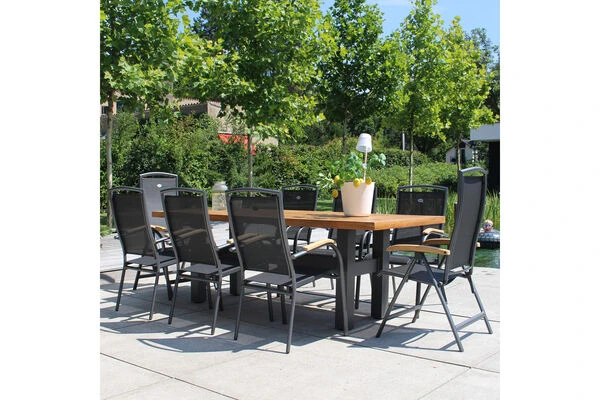 Der Tisch besteht aus einem hochwertigen Aluminiumgestell in der Farbe „Xerix“ (Anthrazit) und einer ca. 4 cm dicken Teakholz-Tischplatte in einem natürlichen Teak-Farbton. Damit hebt sich dieses Modell von den üblichen Tischen aus der Yasmani-Serie ab, denn diese gibt es normalerweise nur mit einer Tischplatte in der Farbe „Vintage Brown“, also mit einer deutlich dunkleren Tischplatte. Das bei diesem Tisch verwendete Teakholz wurde allerdings so behandelt, dass es zu 100% dem FSC-Teakholz Farbton entspricht und damit perfekt zu den im Set inbegriffenen Sesseln aus der „Alice Comfort“-Serie passt. Mit seiner Größe von ca. 240 x 100 x 77 cm bietet er dabei ausreichend Platz für 8 Personen.