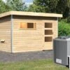 1 x KARIBU Mainburg 4 Saunahaus, naturbelassen, Fichte, 490x368x229 cm, SET A mit Doppelflügeltür, Vorraum und 9 kW Ofen