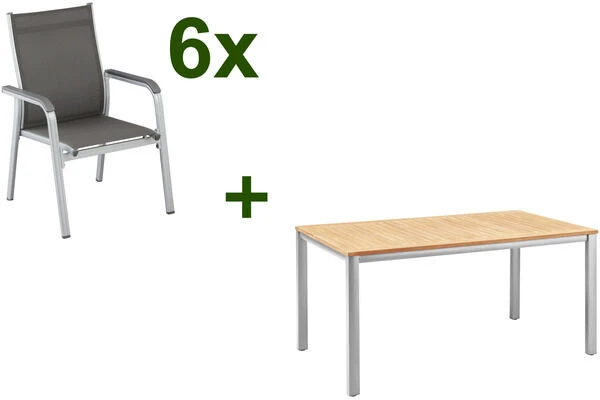Edel und natürlich präsentiert sich diese Esstischgruppe, die Sie schon bald Ihr Eigen nennen könnten. Das Set besteht aus einem edlen Teakholz-Gartentisch mit den Maßen von ca. 160 x 95 x 74 cm und 6 Stapelsesseln in der Farbe silber/anthrazit.