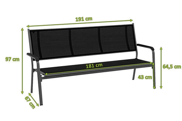 Mit der 3er-Bank aus der BasicPlus Serie bequem durch den Sommer. Das solide und formschöne Gestell besteht aus edlem, anthrazitfarbenen Aluminium. Die ebenfalls anthrazite Sitzfläche wird aus wasserdurchlässigem, hochwertigem Outdoorgewebe gefertigt. Die Sitzfläche nimmt kein Wasser auf und trocknet schnell, so können Sie auch nach einem kleinen Regenschauer rasch wieder Platz nehmen. Das luftige Gewebe ist formstabil und trotzdem sehr bequem und zusätzlich UV- und sonnenölbeständig – insgesamt also der perfekte Begleiter in Ihrem Garten. Die Sessel lassen sich aufstapeln – wenn sie nicht benötigt werden können Sie sie platzsparend verstauen.