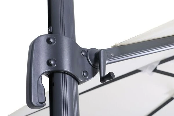 | Kurbelsystem Mit der im Griffteil eingearbeiteten Kurbelmechanik können Sie den Schirm ganz einfach öffnen und schlieĂen. Des Weiteren können Sie hiermit die Dachneigung komfortabel einstellen.  | |