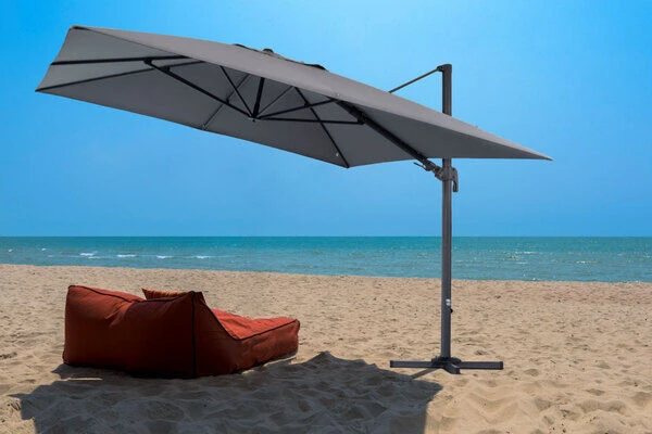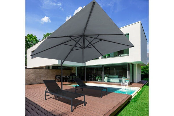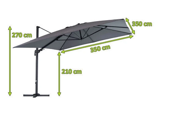 Der quadratische Sonnenschirm von OUTFLEXXÂź besticht durch seine hochwertig verarbeiteten Materialien und seine praktischen Funktionen. Das ca. 350 x 350 cm groĂe Schirmtuch besteht aus 100% Polyester (ca. 250 g/mÂČ). ZusĂ€tzlich ist das anthrazitfarbene Schirmtuch wasserabweisend imprĂ€gniert. Das Gestell besteht aus pulverbeschichtetem Aluminium in anthrazit und hat dabei eine Haupt-Rohrdicke von ca. 65 x 95 mm. Der Ampelschirm besitzt keinen Mittelmast und bietet daher eine praktische Lösung, um ohne Probleme eine komplette Sitzgruppe zu beschatten. Die groĂzĂŒgige Durchgangshöhe von ca. 210 cm schrĂ€nkt die Nutzung Ihrer Terrasse in keinster Weise ein. Durch einen hohen UV-Schutz von 80+ spendet der Sonnenschirm dabei extra viel Schatten. Die Beschattung bei unterschiedlicher Sonneneinstrahlung ist mit diesem praktischen Ampelschirm problemlos möglich, da das Schirmtuch entlang des Standrohres und des StĂŒtzbalkens geneigt werden kann. Zudem lĂ€sst sich der Schirm durch den leichtgĂ€ngigen Kurbelmechanismus kinderleicht aufspannen. Diese Kurbel können Sie in den unteren Teil des Schirmstocks umstecken und so den Schirm um 360° drehen. Das integrierte Air-Vent System lĂ€sst auch bei sehr warmen Klima die Luft unter dem Schirmtuch zirkulieren. Die 8 eingebauten Dachstreben mit den MaĂen von ca. 17 x 25 mm sorgen zusĂ€tzlich fĂŒr weitere Standfestigkeit. Im Lieferumfang ist ein PlattenstĂ€nder fĂŒr Wegplatten enthalten. Um einen sicheren Stand zu gewĂ€hrleisten, empfehlen wir Ihnen den ca. 29 kg schweren Ampelschirm mit ca. 200 kg Wegplatten zu beschweren. Bitte beachten Sie, dass die Platten NICHT mit im Lieferumfang enthalten sind.