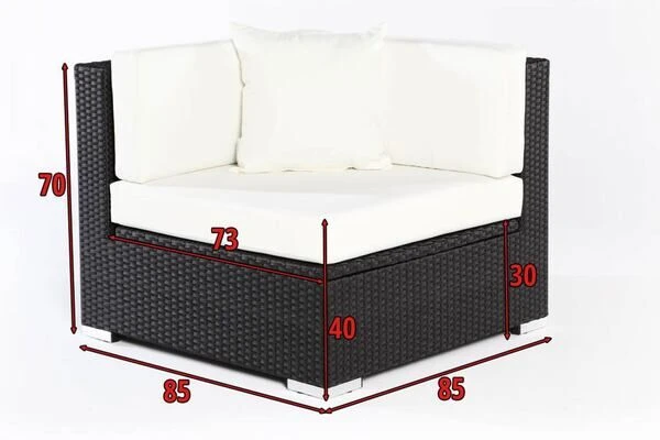 Ob als Bestandteil einer Gartenlounge oder als Balkonmöbel: Dieses Modulelement bietet Ihnen die beste Grundlage für Ihre individuelle Gartengestaltung. Das Eckelement ist absolut wetterfest und äußerst pflegeleicht. Extreme Temperaturen zwischen -60°C und +70°C können der Polyrattanfaser nichts anhaben. Das einsitzige Eckelement verfügt über edle Aluminiumfüße, die dank der Kunststoffnoppen Ihren Bodenbelag schonen und einen schönen Kontrast zur flachen Polyrattanfaser bilden. Dieses Eckelement bietet Ihnen mit seiner bequemen Polsterung besten Komfort, um stundenlang relaxen zu können. Die Sitzfläche lässt sich hochklappen. Der Stauraum darunter ist mit einer wasserdichten Kissentasche ausgestattet, die mittels Reißverschluss geschlossen wird. Alle Polster lassen sich so sicher und problemlos verstauen. Das Eckelement ist jeweils mit bis zu ca. 150 kg belastbar. Einzelne Modulelemente bieten zudem den praktischen Vorteil, Ihre Gartenlounge bei Bedarf zu erweitern und immer wieder neu anzuordnen.