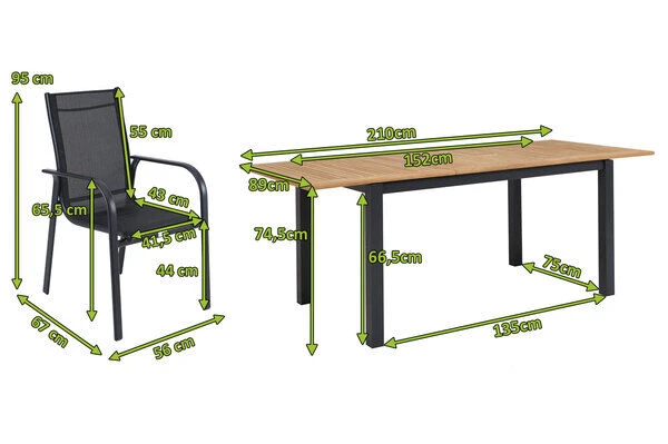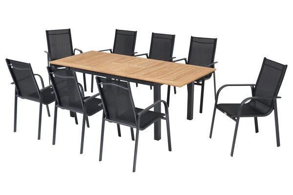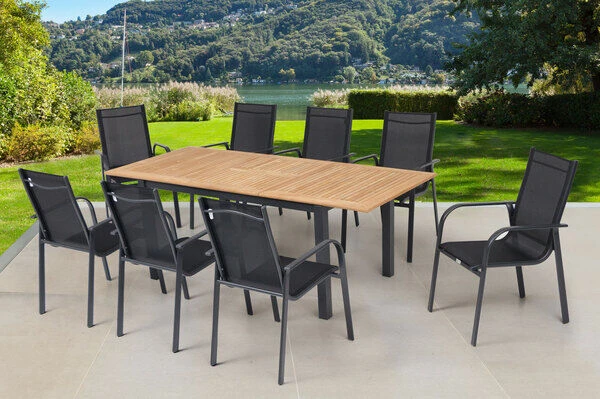 9-teilige Esstischgarnitur von OUTFLEXX® aus Aluminium/Textilene in schwarz, 8 Stapelsessel und Ausziehtisch 152/210x89x74,5cm mit recyceltem FSC®-Teakholz