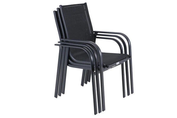 Leicht wie eine Sommerbrise und doch stabil und robust! Für das solide Gestell der erstklassigen Stapelsessel kommt korrosionsbeständiges Aluminium zum Einsatz. Die schwungvollen, designstarken Armlehnen sorgen für zusätzlichen Komfort. Bespannt werden die durchgehenden Rücken- und Sitzflächen mit Textilene im passenden Schwarzton. Es ist unglaublich hautsympathisch und sorgt für ein herrliches Sitzgefühl, das Sie auch in der Sommerhitze nicht im Stich lässt. Die Gesamtmaße liegen jeweils bei ca. 67 x 56 x 95 cm. Mit einer Sitzbreite von ca. 41,5 cm und einer Sitztiefe von ca. 43 cm sitzen Sie stets bequem. Dank des schlanken Designs und geringen Gewichtes von ca. 2,8 kg lassen sich die Leichtgewichte auch prima transportieren, stapeln und platzsparend verstauen.