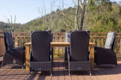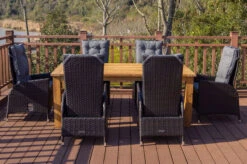 Ausgefallen, natürlich und robust – diese Esstischgarnitur aus dem Hause OUTFLEXX® überzeugt durch die Kombination aus hochmodernen Polyrattanmöbeln und einem geschmackvollen Esstisch aus recyceltem Teakholz. Dieses Set enthält einen Esstisch und 6 Diningsessel in der Farbe Outflexx PremiumLine braun.