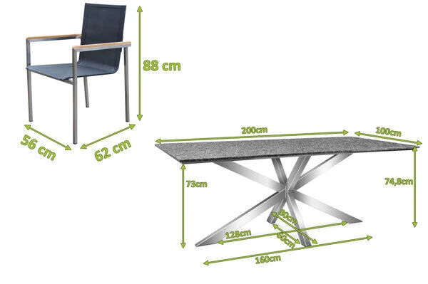 OUTFLEXX Esstischgarnitur, silber/anthrazit, Edelstahl/Granit/Textil, 200×100 cm, 6 Gartensessel, Armlehnen aus FSC-Teak