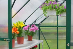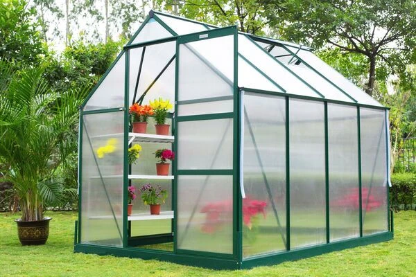 Gewächshaus von OUTFLEXX® aus grünem Aluminium und Hohlkammerplatten aus ca. 6 mm Polycarbonat