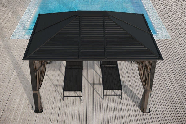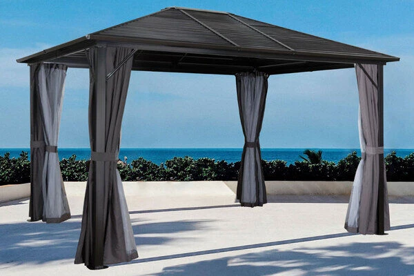 Dieser moderne Hardtop Pavillon von OUTFLEXXÂź verschafft Ihnen mit einer GröĂe von ca. 300 x 365 cm eine gerĂ€umige und ĂŒberdachte Oase in Ihrem Garten. Speziell fĂŒr die ganzjĂ€hrige AuĂennutzung konzipiert, besteht das Gestell aus pulverbeschichtetem Aluminium und trĂ€gt die Farbe Braun, wodurch sich der Pavillon unaufdringlich in den Garten integriert. Aluminium ist ein gern und oft verwendetes Material beim Bau von Gartenmöbeln, da es eine hohe StabilitĂ€t und Langlebigkeit aufweist. Zudem ist es ein leichtes Material, besitzt eine gute KorrosionsbestĂ€ndigkeit und ist witterungsbestĂ€ndig. Die Pulverbeschichtung verbessert zusĂ€tzlich die StoĂ-, Schlag- und Kratzfestigkeit des Materials und verleiht dem Aluminium einen dauerhaften Korrosionsschutz und eine anhaltende KorrosionsbestĂ€ndigkeit. Die massive Konstruktion hat ein Gesamtgewicht von ca. 80,7 kg und steht auf ca. 76 x 76 mm dicken Pfosten.