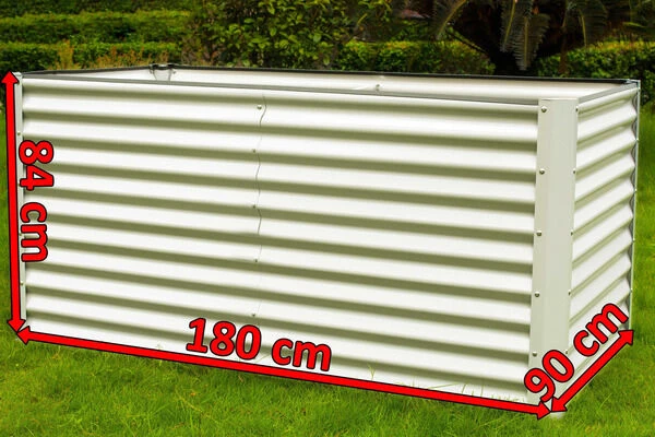 Das cremefarbene Hochbeet aus dem Material Zincalume,  hat die MaĂźe von ca. 180 x 90 x 84 cm und ist dank seines Gewichts von nur ca. 15,7 kg sehr flexibel und kann kinderleicht umgesetzt werden. Beim Werkstoff „Zincalume“ handelt es sich um ein mit Zink und Aluminium beschichtetes Stahlblech, das durch die Beschichtung jahrelang resistent gegen Umwelt- und WitterungseinflĂĽsse ist. Seine Lebensdauer ist vier mal länger als bei galvanisiertem Stahl.