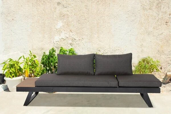 Verstellbare Lounge/Liege von OUTFLEXX aus Aluminium und Textilene, mit Polyesterpolstern in modernem Dunkelgrauton, 228×78 cm, mit praktischer Ablage aus Holzimitat
