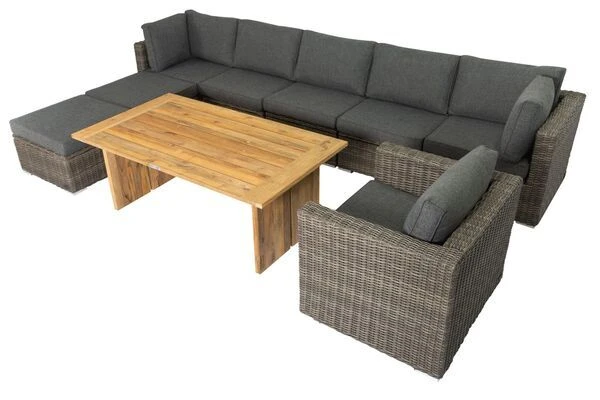 Warum sollten Sie im Garten auf Ihren gewohnten Komfort verzichten? Verlagern Sie Ihr Wohnzimmer für die Sommerzeit einfach nach draußen! Mit diesen hochwertigen Loungemöbeln aus Polyrattan und dem Loungetisch aus recyceltem Teakholz mit den Maßen von ca. 160 x 90 x 62 cm geht das ganz einfach.