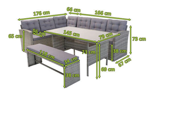 Diese Loungegruppe besteht aus einem Ecksofa, einer Sitzbank und einem Gartentisch. Diese Polyrattangarnitur wurde eigens fĂĽr den ganzjährigen Aufenthalt im Freien konzipiert. Das flache, hellgrau meliert Geflecht aus Polyrattan bedeckt ein Gestell aus pulverbeschichtetem Aluminium. Aluminium ist ein gern und oft verwendetes Material beim Bau von Gartenmöbeln, da es eine hohe Stabilität und Langlebigkeit aufweist. Zudem ist es ein leichtes Material, besitzt eine gute Korrosionsbeständigkeit und ist witterungsbeständig. Auch wenn das Gestell nicht sichtbar ist, trägt es eine Pulverbeschichtung, da diese dem Aluminium einen dauerhaften Korrosionsschutz und eine anhaltende Korrosionsbeständigkeit verleiht. Polyrattan ist ein kĂĽnstlich hergestelltes Flechtmaterial auf Kunststoffbasis und glänzt vor allem durch die Eigenschaften Elastizität und UV-Beständigkeit. Dazu ist das Material elastisch, besitzt eine natĂĽrliche Optik und braucht nur wenig Pflege – so werden Sie mit wenig Aufwand lange Freude an Ihren neuen Gartenmöbeln haben!