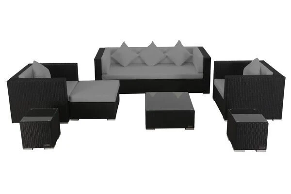 Dieses OUTFLEXX® Loungemöbel-Set aus schwarzem, flachen Polyrattan mit Sitzplätzen für bis zu sechs Personen sieht nicht nur großartig aus, sondern bietet darüber hinaus verschiedene Anordnungsmöglichkeiten.
