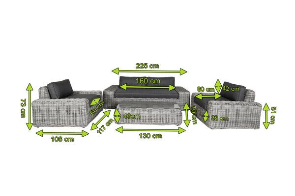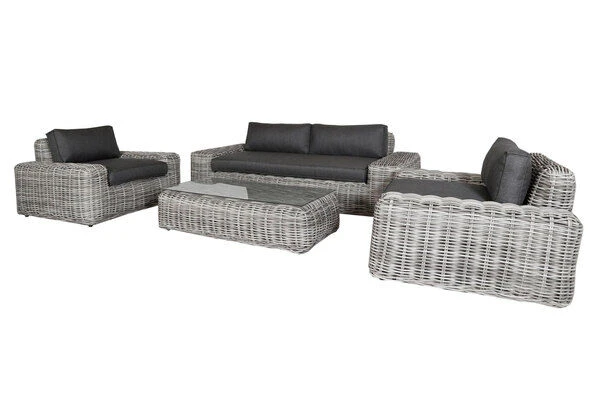 Polyrattan – ein zeitloser Klassiker – Die hier verwendeten Polyrattan Fasern in white faded grey bringen neue Farbe in Ihren Garten. Kombiniert mit den KissenbezĂĽgen in Anthrazit harmonieren sie perfekt. Als zeitloser Klassiker wird Polyrattan Ihren AnsprĂĽchen an Qualität in allen Belangen gerecht. Polyrattan ist strapazierfähig, pflegeleicht und witterungsbeständig, so dass diese Loungegarnitur problemlos das ganze Jahr ĂĽber im Freien stehen kann.