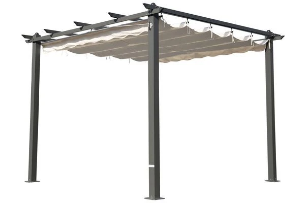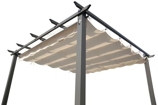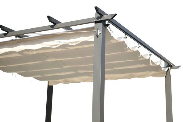 Durch einfaches Schieben kann die Bespannung am Dach geöffnet oder geschlossen werden, so dass je nach Bedarf über Schatten- und Sonnenplätze entschieden werden kann. Das Gestell der Pergola, das die ca. 2,6 x 2,6 Meter große, wasserabweisend imprägnierte Bespannung aushält, ist aus pulverbeschichtetem Aluminium gefertigt und in dezemntem Anthrazit gehalten. Eine Bespannung in der Farbe beige ergänzt das zeitlose Design. Diese ist aus 100% Polyester (220 g/m²) gefertigt und wird durch Dachstreben aus pulverbeschichtetem Aluminium gehalten. Die verwendeten hochwertigen Materialien und deren Verarbeitung sorgen dafür, dass die Pergola besonders strapazierfähig und witterungsbeständig ist.