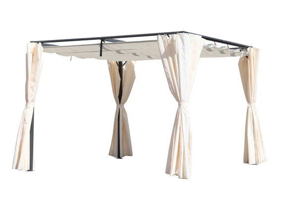 OUTFLEXX® Pergola aus Stahl mit Textilbespannung in creme und Laufschienensystem
