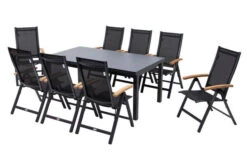 9-teilige Esstischgarnitur von OUTFLEXX® aus Aluminium/Textilene in OUTFLEXX® anthrazit matt/grau, Premium Ausziehtisch 180/240x100x76cm, inkl. 8 Multipositionssessel mit recyceltem FSC®-Teakholz
