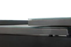 Seine besondere Optik verdankt er der Kombination aus der ca. 5 cm dicken Tischplatte aus Alu/Einscheibensicherheitsglas und dem matten anthrazitfarbenen Aluminiumgestell. Das ca. 5 mm dicke Sicherheitsglas überzeugt durch seine zahlreichen Vorteile und seine besondere Optik. Die geriffelte Tischplattenoberfläche sorgt dafür, dass das einfallende Licht nicht reflektiert wird und so ein matter Effekt entsteht. Der graue Siebdruck auf der Unterseite der Glasplatte sorgt für die graue Optik der Tischplatte.