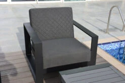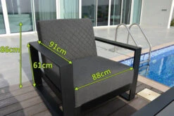 Für Ihre individuelle Gartengestaltung ist der Sessel (ca. 88 x 91 x 86 cm) auch einzeln erhältlich. Sie können ihn vielfältig kombinieren. Die Sitzflächen sind ca. 58 cm tief und die Sitzhöhe beträgt ca. 43 cm. Der Oberstoff in der Sunbrellafarbe sooty sowie die gesteppte Oberfläche der Rückenlehne unterstreichen den einzigartigen Charakter des Stuhls. Für das Gestell wird robustes, pulverbeschichtetes Aluminium verwendet, welches mit der Schaumstoff-Sunbrella Kombination eine solide Sitzmöglichkeit bietet. Sie höchsten Sitzgenuss und die Entspannung kommt fast von allein.