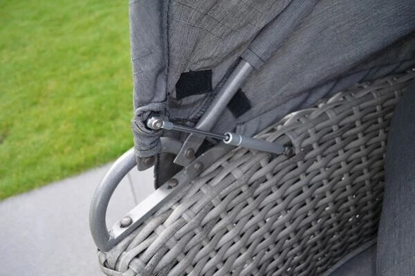 An sonnigen Tagen verwenden Sie einfach das Sonnenschutzdach, das dank Springmechanismus schnell aufzustellen und mit Knebelhaken am Grundgestell zu fixieren ist – so spendet es Ihnen angenehmen Schatten und schĂĽtzt auĂźerdem vor Wind oder unerwĂĽnschten Blicken. Da nicht immer die Sonne scheint, sorgt die Wetterbeständigkeit und Pflegeleichtigkeit des Materials fĂĽr den nötigen Schutz. Die synthetische Faser Olefin wird fĂĽr ihre Hitzebeständigkeit und optimalen Trage- und Pflegeeigenschaften geschätzt. Polyrattan ist ebenfalls eine wetterfeste Faser, die besonders widerstandsfähig gegen UmwelteinflĂĽsse ist und wird perfekt durch das Gestell aus pulverbeschichtetem Aluminium ergänzt.