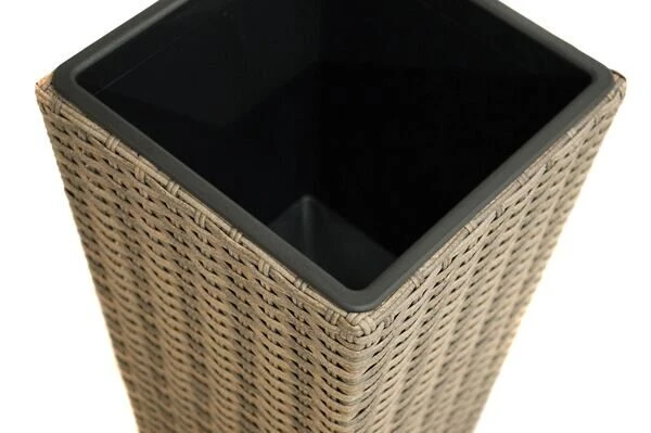 Das Pflanzgefäß besitzt einen pulverbeschichteten Stahlrahmen, dies macht es nicht nur stabil, sondern sorgt auch dafür, dass es einen sicheren Stand hat, auch bei Windböen o.Ä. Das Gestell wird mit Polyrattangeflecht bespannt. Das doppel-halbrunde Geflecht ist in der Farbe champagner-meliert gehalten und passt so wunderbar zu allen möglichen Terrasseneinrichtungen. Innen befindet sich ein schwarzer Kunststoffeinsatz, der sich nach Belieben bepflanzen lässt. Der Kunststoffeinsatz besitzt einen Abfluss für überschüssiges Wasser. Dieser kann per Hand herausgedrückt werden, Sie haben also die Wahl, ob Sie das Gefäß drinnen oder draußen aufstellen. Drinnen bleibt das Loch zu, für draußen kann es geöffnet werden, damit das Wasser gut abfließt. Das konische Pflanzgefäß mit den Maßen von ca. 28 x 28 x 60 cm passt optisch perfekt zu den Gartenmöbeln der Serie Rabida Basic, Rabida und Rabida Comfort von Ploß.