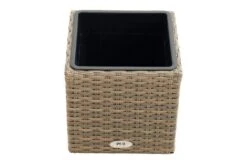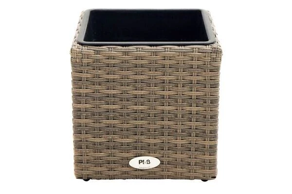 Das Pflanzgefäß besitzt einen pulverbeschichteten Stahlrahmen, dies macht es nicht nur stabil, sondern sorgt auch dafür, dass es einen sicheren Stand hat, auch bei Windböen o.Ä. Das Gestell wird mit Polyrattangeflecht bespannt. Das doppel-halbrunde Geflecht ist in der Farbe champagner-meliert gehalten und passt so wunderbar zu allen möglichen Terrasseneinrichtungen. Innen befindet sich ein schwarzer Kunststoffeinsatz, der sich nach Belieben bepflanzen lässt. Der Kunststoffeinsatz besitzt einen Abfluss für überschüssiges Wasser. Dieser kann per Hand herausgedrückt werden, Sie haben also die Wahl, ob Sie das Gefäß drinnen oder draußen aufstellen. Drinnen bleibt das Loch zu, für draußen kann es geöffnet werden, damit das Wasser gut abfließt. Das kubische Pflanzgefäß mit den Maßen von ca. 28 x 28 x 28 cm passt optisch perfekt zu den Gartenmöbeln der Serie Rabida Basic, Rabida und Rabida Comfort von Ploß.