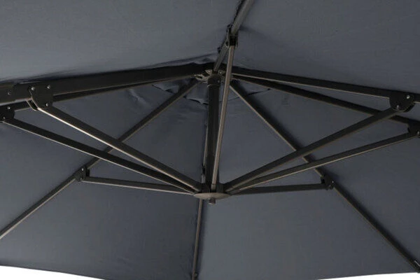 Der Ampelschirm Sunset N+ ohne Volant lässt durch seinen seitlich stehenden Mast viel Platz für Ihre Stühle und Tische. Das anthrazitfarbene Schirmtuch des Sonnenschirms ist ca. 300 x 300 cm groß und der Schirm ist ca. 190 cm hoch. Durch den 360° drehbaren Mast sowie die Neigungs- und Kippfunktion lässt sich der Schirm perfekt dem Sonnenstand anpassen und spendet immer den gewünschten Schatten. Der hochwertige Schirmstoff aus 100 % Polyester (ca. 300 g/m²) bieten einen exzellenten UV-Schutz und einen Lichtschutzfaktor von UPF 50+. Zudem kann der Bezug abgenommen und per Hand gewaschen werden. Der stabile Aluminiummast ist in Anthrazit pulverbeschichtet und damit höchst witterungsbeständig. Acht genietete Streben (ca. 14 x 24 cm) aus Aluminium sorgen für die nötige Stabilität und Flexibilität. Der einteilige, ovale Unterstock misst ca. 53 x 80 cm. Zum bequemen Öffnen und Schließen des Schirms kommt die handliche Kurbel zum Einsatz. Das Windventil am oberen Ende des Sonnenschirms verhindert das Umfallen bei starken Windböen.