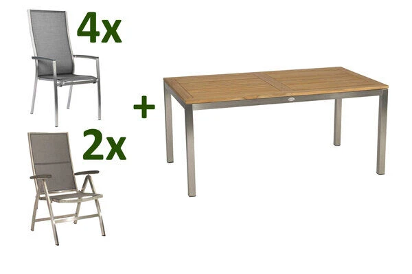 4x Stapelsessel Cardiff silbergrau aus Edelstahl/Textil/Aluminiumarmlehne ca. 68,5x56x110 cm (416895) 2x Multipositionssessel Cardiff, silber gepolstert, Edelstahl/Textilen/Aluminiumarmlehnen, ca. 69x60x110 cm (417424) 1x STERN Ausziehtisch, silber/natur, Edelstahl/FSC-Teakholz, ca. 162/220x90x75 cm, Butterfly-Auszug (417379)