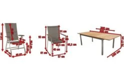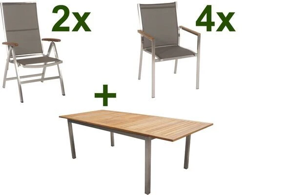 STERN Cardiff Esstischgruppe, Silber/taupe, Edelstahl/FSC-Teak, Tisch 200/300 X 100 Cm, 4 Stapel-, 2 Multipositionssessel