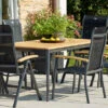 Die Sessel überzeugen nicht nur durch ihr zeitloses Design und die hochwertigen Materialien, sondern vor allem auch durch ihren Komfort und ihre Funktionalität. Mit einer maximalen Belastbarkeit von ca. 120 kg sind die Sessel zudem sehr stabil. Sie werden Ihnen durch ihre hohe Widerstandsfähigkeit gegen Wind und Wetter viele Jahre Freude bereiten. Das Textilengewebe in der Farbe Taupe ist formstabil, bequem und besonders pflegeleicht. Leichte Verschmutzungen lassen sich ganz einfach mit ein wenig Wasser wieder entfernen. Das für die Armlehnen verwendete Teakholz ist FSC-zertifiziert und stammt damit aus verantwortungsvollen Quellen. So können Sie sich guten Gewissens zurücklehnen und sich so richtig entspannen. Die Rückenlehne der Hochlehner lässt sich kinderleicht mehrfach verstellen und bietet damit einen hervorragenden Sitzkomfort. Je nach Bedarf können die Hochlehner zusammengeklappt und die Stapelsessel ineinander gestapelt, und somit platzsparend verstaut werden.