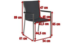 Der Polaris überzeugt nicht nur mit seinen dunklen Farben – die ihn vielfältig kombinierbar und vor allem zeitlos machen – und den hochwertigen Materialien, sondern vor allem auch durch seinen Komfort und seine Funktionalität. Schlicht, nicht aufdringlich und dennoch ein Hingucker. So lässt sich der Polaris wohl am besten beschreiben. Holen Sie sich mit diesem Stapelsessel die perfekte Kombination aus Eleganz und Sitzkomfort nach Hause und relaxen Sie z.B. bei einer gemütlichen Tasse Tee und dem passenden Buch nach Ihrem Feierabend. Die hochwertigen Materialien und die sorgfältige Verarbeitung sorgen nicht nur für die besondere Optik dieses Stuhls, sondern machen ihn mit einer Belastbarkeit von ca. 120 kg auch sehr stabil. Der Polaris ist durch seine hohe Widerstandsfähigkeit gegen Wind und Wetter der perfekte Begleiter für viele Jahre und wird Ihnen viele Sommer Freude bereiten. Das verwendete Edelstahl der Güteklasse 304 ist rostfrei und ebenso wie das Textilgewebe der Sitzfläche und Rückenlehne besonders pflegeleicht. Leichte Verschmutzungen lassen sich ganz einfach mit ein wenig Wasser wieder entfernen. Alle verwendeten Materialien sind besonders hautfreundlich, formstabil und UV-beständig, so dass Sie den Polaris sorgenfrei in Ihrem Garten stehen lassen können. Durch seine Stapelfunktion und den Maßen von ca. 61 x 54 x 89 cm lässt sich der Stuhl aber dennoch platzsparend verstauen, wenn Sie doch einmal etwas mehr Platz auf Ihrer Terasse oder im Garten benötigen sollten.