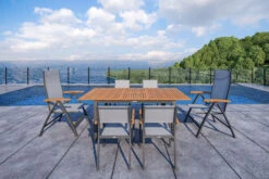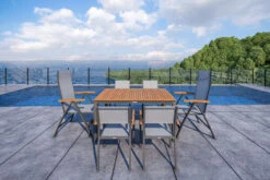 Diese Villana Esstischgruppe bietet genügend Platz für sechs Personen und besitzt auch in Sachen Komfort und Verarbeitung nur die beste Qualität. Die Farb- und Materialkombination aus anthrazit, grau, Aluminium, Textilene und FSC-Akazienholz sorgt für eine rustikale Eleganz, welche die vielfältige Kombination mit anderen Möbelstücken oder Dekoration ermöglicht. Der Tisch kann bis auf eine Länge von ca. 200 cm ausgezogen werden – perfekt, wenn sich noch spontaner Besuch ankündigt oder Sie einen schönen Grillabend mit Freunden und Nachbarn planen. Mit einer Breite von ca. 90 cm bietet er zudem genügend Platz, um reichlich bestückt zu werden. Mit seiner Höhe von ca. 75 cm besitzt dieser Tisch eine ideale Wohlfühlhöhe. Der Ausziehtisch lässt sich ganz einfach durch einen genialen Flügelmechanismus ein- und wieder ausklappen. Die Tischplatte ist an beiden Seiten mit einem kleinen Pin unter der Tischplatte fixiert. Dieser Pin wird zunächst an beiden Seiten gelöst. So kann die Hälfte der Tischplatte nach links und die andere Hälfte nach rechts gezogen werden. Anschließend klappt man die darunterliegende Tischplatte hoch und auseinander. Zum Schluss werden die äußeren Teile der Tischplatte an die Mitte rangeschoben und wieder mit dem Pin unter dem Tisch fixiert. Der Tisch wird nach dem gleichen Prinzip wieder eingeklappt. Der Tisch wiegt ca. 18,8 kg und die Tischplatte weist neben einem neuen Design, eine verbesserte Stabilität auf. Die Tischplatte ist ca. 20 mm dick. Das hochwertige Aluminiumgestell wurde sowohl bei dem Ausziehtisch als auch bei den Stühlen pulverbeschichtet und kommt in einem eleganten anthrazit daher. Die Pulverbeschichtung sorgt für längere Haltbarkeit und Witterungsbeständigkeit.