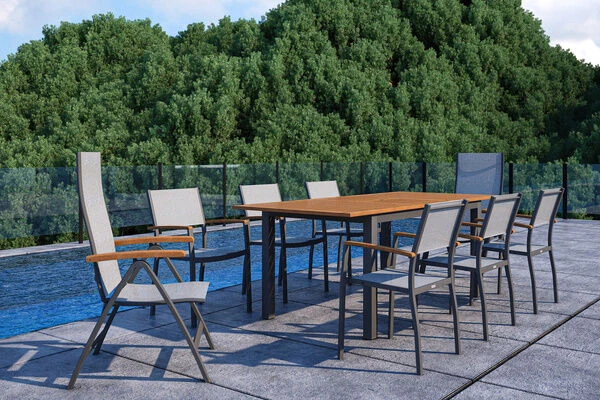 Diese Villana Esstischgruppe bietet genĂĽgend Platz fĂĽr acht Personen und besitzt auch in Sachen Komfort und Verarbeitung nur die beste Qualität. Die Farb- und Materialkombination aus anthrazit, grau, Aluminium, Textilene und FSC-Akazienholz sorgt fĂĽr eine rustikale Eleganz, welche die vielfältige Kombination mit anderen MöbelstĂĽcken oder Dekoration ermöglicht. Der Tisch kann bis auf eine Länge von ca. 200 cm ausgezogen werden – perfekt, wenn sich noch spontaner Besuch ankĂĽndigt oder Sie einen schönen Grillabend mit Freunden und Nachbarn planen. Mit einer Breite von ca. 90 cm bietet er zudem genĂĽgend Platz, um reichlich bestĂĽckt zu werden. Mit seiner Höhe von ca. 75 cm besitzt dieser Tisch eine ideale WohlfĂĽhlhöhe. Der Ausziehtisch lässt sich ganz einfach durch einen genialen FlĂĽgelmechanismus ein- und wieder ausklappen. Die Tischplatte ist an beiden Seiten mit einem kleinen Pin unter der Tischplatte fixiert. Dieser Pin wird zunächst an beiden Seiten gelöst. So kann die Hälfte der Tischplatte nach links und die andere Hälfte nach rechts gezogen werden. AnschlieĂźend klappt man die darunterliegende Tischplatte hoch und auseinander. Zum Schluss werden die äuĂźeren Teile der Tischplatte an die Mitte rangeschoben und wieder mit dem Pin unter dem Tisch fixiert. Der Tisch wird nach dem gleichen Prinzip wieder eingeklappt. Der Tisch wiegt ca. 18,8 kg und die Tischplatte weist neben einem neuen Design, eine verbesserte Stabilität auf. Die Tischplatte ist ca. 20 mm dick. Das hochwertige Aluminiumgestell wurde sowohl bei dem Ausziehtisch als auch bei den StĂĽhlen pulverbeschichtet und kommt in einem eleganten anthrazit daher. Die Pulverbeschichtung sorgt fĂĽr längere Haltbarkeit und Witterungsbeständigkeit.