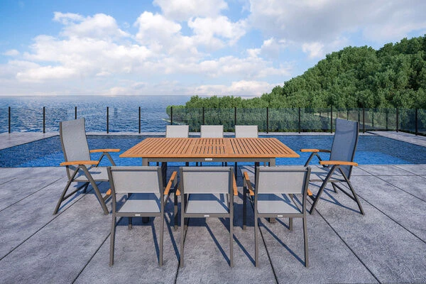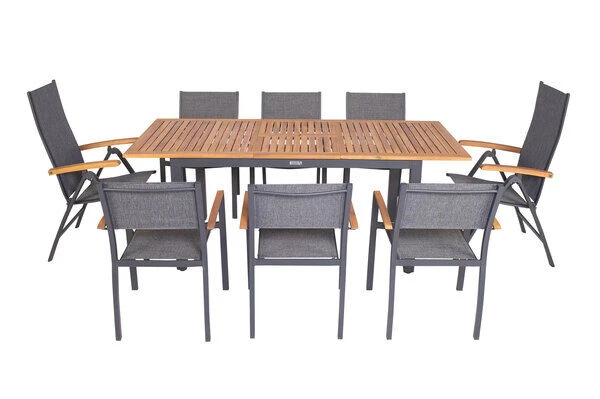 VILLANA Esstischgarnitur, anthrazit/grau, Alu/ FSC-Akazienholz, Ausziehtisch ca. 150/200 cm, 6 StapelstĂĽhle, 2 Multipositionssessel