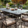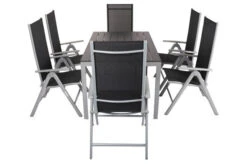 Diese Esstischgarnitur besteht aus einem Gartentisch und 6 bequemen Sesseln – perfekt, für eine gemütliche Runde aus Freunden, Familie oder Nachbarn. Bei Bedarf können Sie diese Gruppe mit passenden Artikeln der VILLANA Serie erweitern. Die Multipositionssessel sind modern und praktisch zugleich! Die Sessel haben ein Gestell aus pulverbeschichtetem Aluminium in der Farbe Silber und Maße von jeweils ca. 67 x 58 x 113 cm. Aluminium ist ein gern verwendetes Material im Gartenmöbelsektor, da es besonders leicht, zeitgleich jedoch sehr stabil ist. Dazu kommt der geringe Pflegeaufwand durch die Pulverbeschichtung. Die meisten Verschmutzungen lassen sich unkompliziert mit Wasser aufweichen und anschließend abspülen oder mit einem weichen Schwamm entfernen. Bei Nichtgebrauch lassen sich die Sessel stapeln und platzsparend verstauen. Dazu ist das Leichtgewicht mit ca. 4,3 kg besonders stabil und beeindruckt mit einer maximalen Belastbarkeit von ca. 160 kg. Dabei kommt der Komfort nicht zu kurz! Die geteilte Sitz- und Rückenfläche ist mit dem modernen Material Textilene (70% Polyvinylchlorid, 30% Polyester) in der Farbe Schwarz bespannt. Das Kunststoffgewebe zeichnet sich vor allem durch seine hohe Belastbarkeit und seinen hohen Komfort aus. Zudem ist es frost- und hitzebeständig, was zusammen mit der hohen Lichtbeständigkeit für eine lange Attraktivität Ihrer Sitzmöbel sorgt. Auch nimmt Textilene kaum Feuchtigkeit auf, so dass die Sitzfläche nach einem Regenschauer schnell wieder trocken ist. Mit einer Sitzbreite von ca. 47 cm und einer Sitztiefe von ca. 41,5 cm wollen Sie aus diesem Stuhl gar nicht mehr aufstehen! Für das Plus an Komfort bietet Ihnen der Multipositionssessel eine 8-fach verstellbare Rückenlehne – lehnen Sie sich zurück und lassen Sie die Alltagssorgen hinter sich.