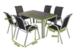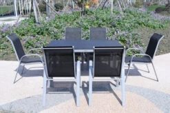 Diese Esstischgarnitur besteht aus einem Gartentisch und 6 bequemen Sesseln – perfekt, fĂĽr eine gemĂĽtliche Runde aus Freunden, Familie oder Nachbarn. Bei Bedarf können Sie diese Gruppe mit passenden Artikeln der VILLANA Serie erweitern. Die Stapelsessel sind elegant und praktisch zugleich! Die Sessel haben ein Gestell aus pulverbeschichtetem Aluminium in der Farbe Silber und MaĂźe von jeweils ca. 75 x 57 x 95 cm. Aluminium ist ein gern verwendetes Material im Gartenmöbelsektor, da es besonders leicht, zeitgleich jedoch sehr stabil ist. Dazu kommt der geringe Pflegeaufwand durch die Pulverbeschichtung. Die meisten Verschmutzungen lassen sich unkompliziert mit Wasser aufweichen und anschlieĂźend abspĂĽlen oder mit einem weichen Schwamm entfernen. Bei Nichtgebrauch lassen sich die Sessel stapeln und platzsparend verstauen. Dazu ist das Leichtgewicht mit ca. 2,9 kg besonders stabil und beeindruckt mit einer maximalen Belastbarkeit von ca. 160 kg. Dabei kommt der Komfort nicht zu kurz! Die durchgängige Sitz- und RĂĽckenfläche ist mit dem modernen Material Textilene (70% Polyvinylchlorid, 30% Polyester) in der Farbe Schwarz bespannt. Das Kunststoffgewebe zeichnet sich vor allem durch seine hohe Belastbarkeit und seinen hohen Komfort aus. Zudem ist es frost- und hitzebeständig, was zusammen mit der hohen Lichtbeständigkeit fĂĽr eine lange Attraktivität Ihrer Sitzmöbel sorgt. Auch nimmt Textilene kaum Feuchtigkeit auf, so dass die Sitzfläche nach einem Regenschauer schnell wieder trocken ist. Mit einer Sitzhöhe von ca. 43 cm und einer Sitztiefe von ca. 50 cm wollen Sie aus diesem Stuhl gar nicht mehr aufstehen!